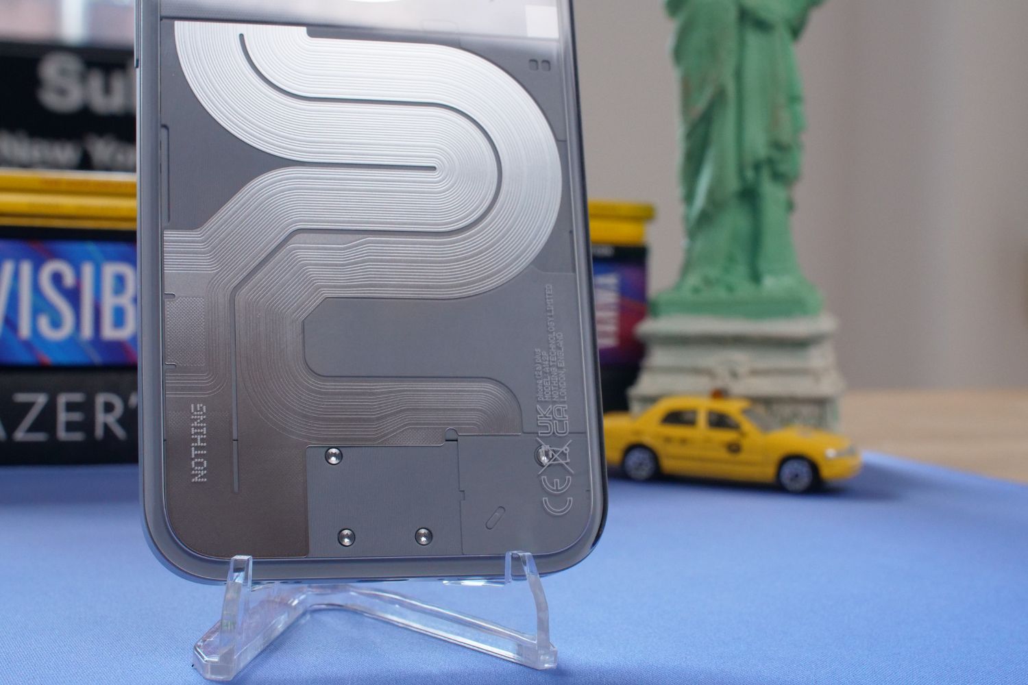 The phone case features a transparent enclosure that proudly showcases all of the phone’s innards. There are visible screws, ribbon cables, and an NFC coil. A pair of horizontal lenses reside in the upper half of the rear, which looks adorably like a pig’s snout. Three glyph lights surround the lenses, arguably this phone’s most exciting design element.