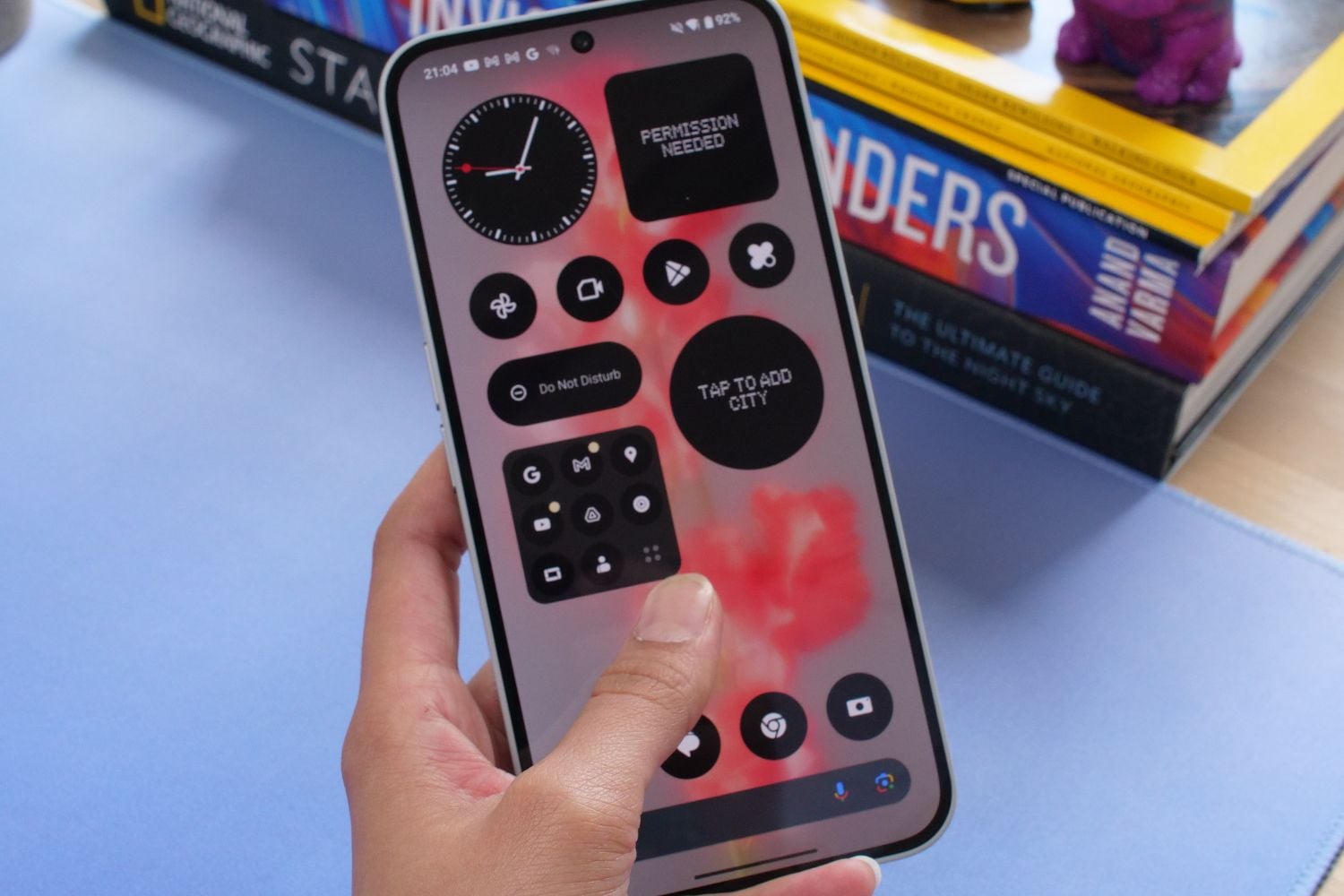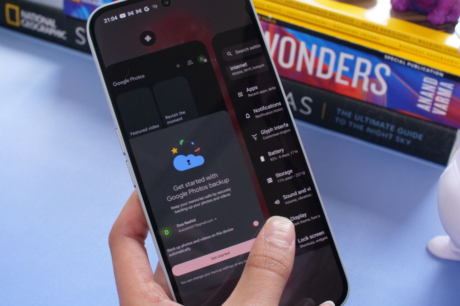 The power button is customizable; with up to a few actions, it can trigger with a double click. I set mine to load up the camera app. Unlike on the Moto Razr+, the multitasking feature is much simpler on Nothing’s phone. Instead of swiping your finger across the screen twice, which often leads to mis-taps, you hold and drag your window to the top of the screen. It automatically appears in a little box and leaves you the rest of the display to carry out other tasks.