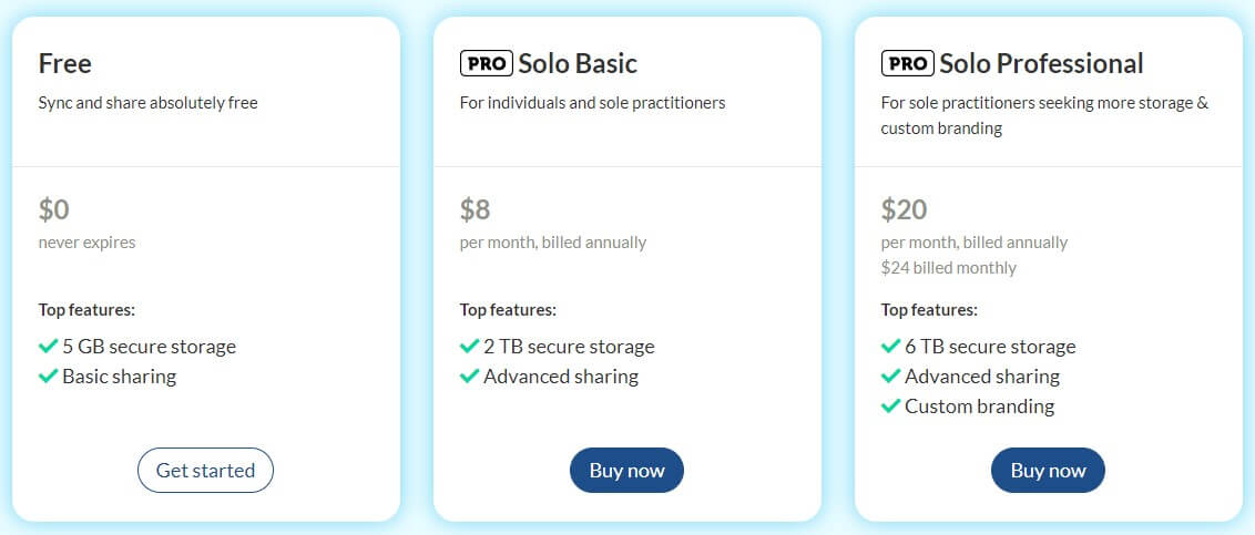 Sync.com’s price is relatively modest. You can get 2 TB of storage for $8 a month in the Solo Basic plan. The Solo Professional bumps it to 6 TB of space at $20 a month. Being one of the best-rated cloud storage for teams, Sync.com offers an unlimited storage plan.