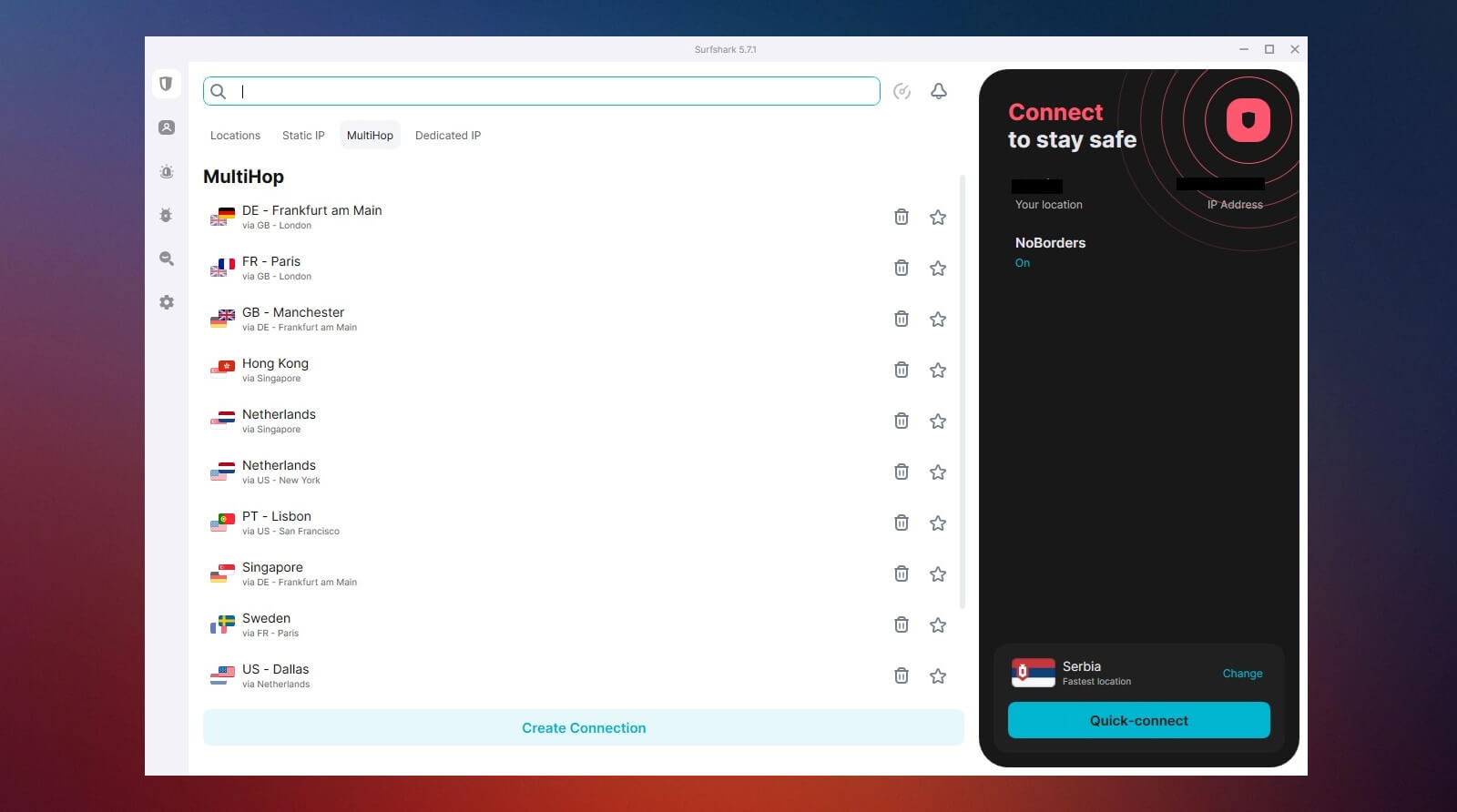 To be clear, Surfshark has these pairs too but if you click on “Create Connection“, you can cherry-pick two countries, pair them, and you’re done. Another feature worth mentioning is the Rotating IP. It’s, at first, similar to MultiHop because it rotates your IP periodically.