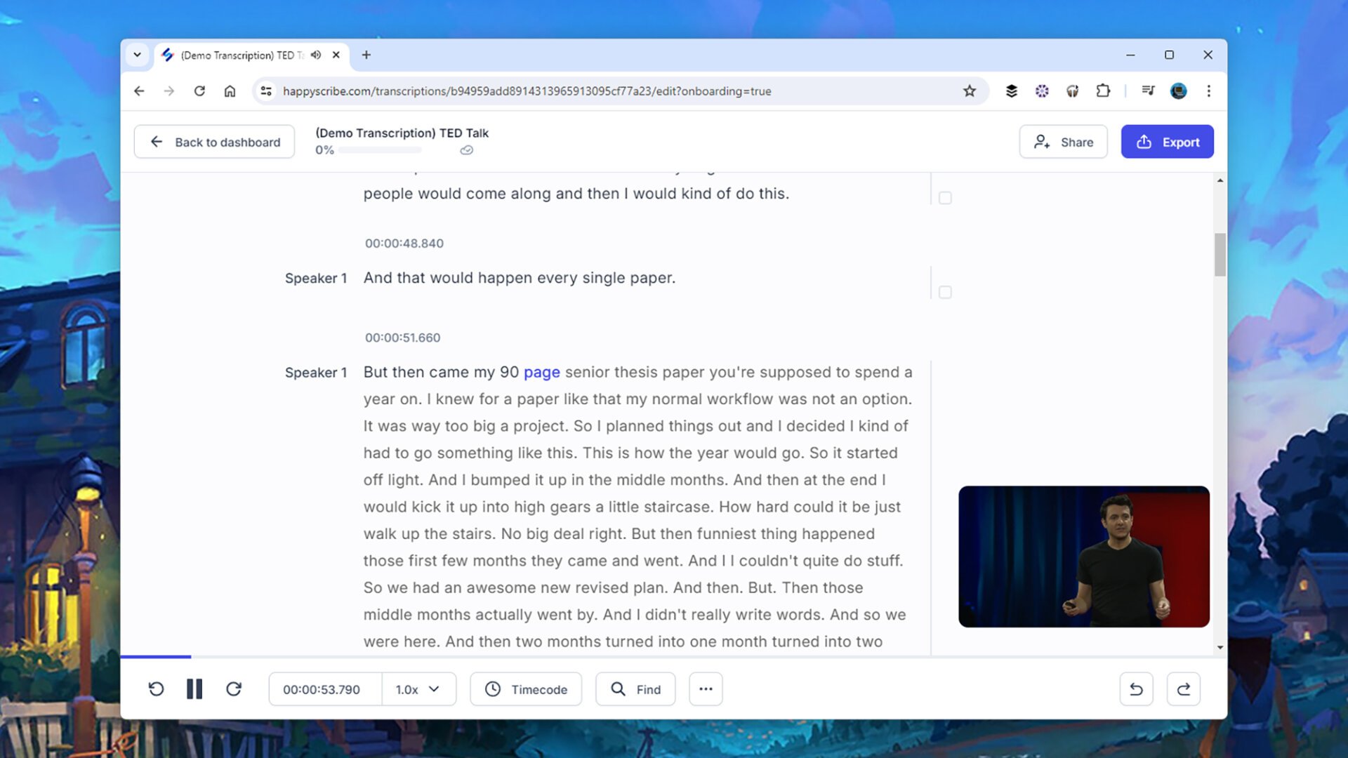 One of the best parts of Happy Scribe is the elegant and streamlined interface—much of it looks like a slightly tweaked Google Docs page—which means everything is easy to navigate. Your transcriptions come with speaker labels and time stamps, and the reviewing tools are simple to use as well.